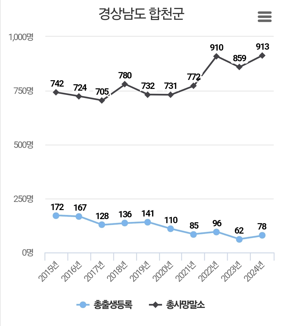 합천군의 65세 이상 고령층은 전체 인구의 45% 이상을 차지하고 있으며, 80세 이상 초고령층도 15.7%를 넘어 전국적으로도 심각한 초고령화 사회로 자리 잡았다. 매년 약 900명의 자연 감소가 발생하는 가운데, 젊은 층이 일자리, 주거환경, 교육·의료·문화시설 부족 등의 이유로 외부로 전출하면서 인구 감소가 더욱 심화되고 있다.