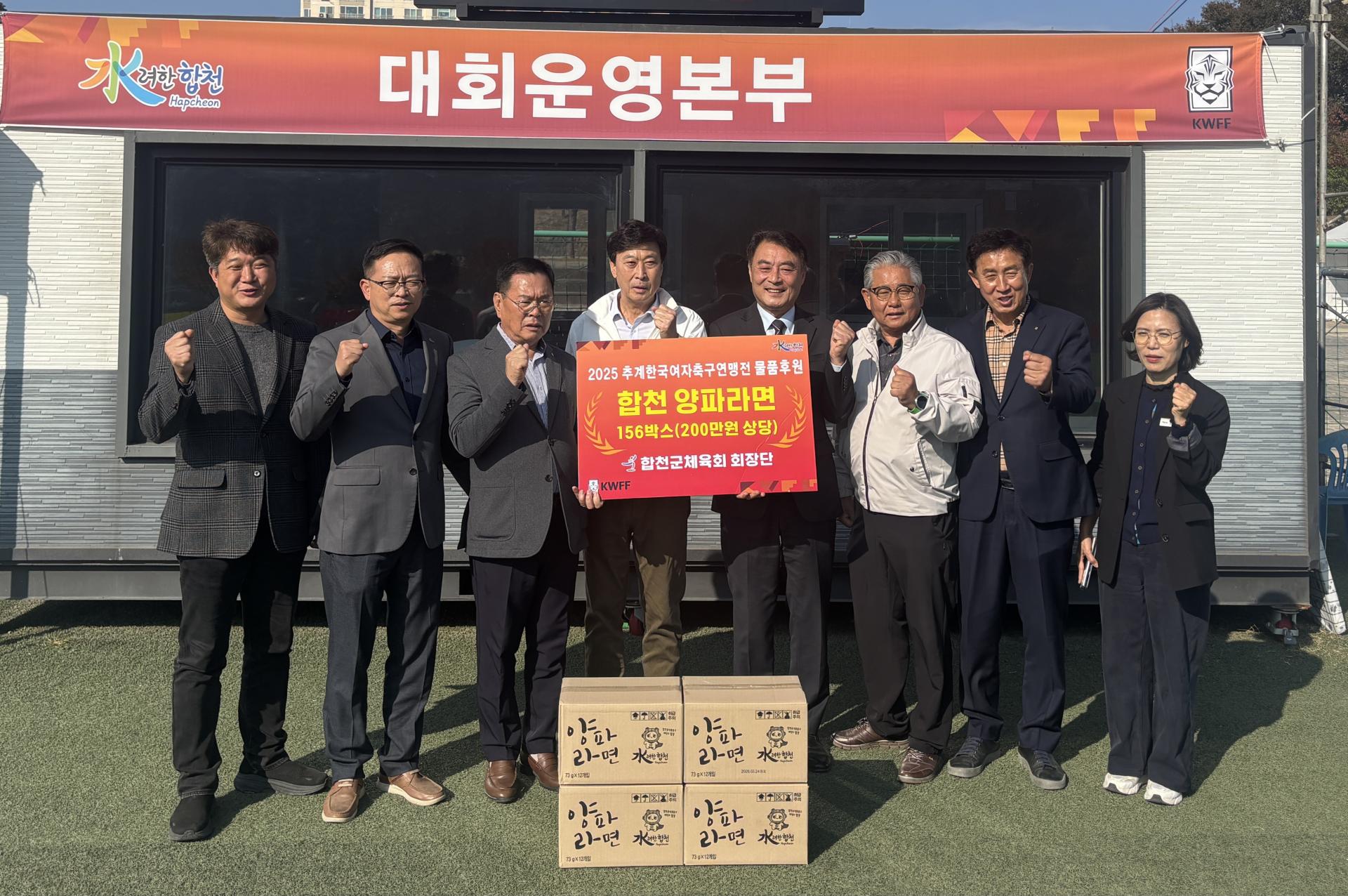 합천군체육회가 지난 5일, ‘2025 추계 한국여자축구연맹전’ 대회 참가선수를 위해 200만 원 상당의 합천 양파라면 156박스를 전달하고 우승을 위해 구슬땀을 흘리고 있는 선수들을 격려했다.