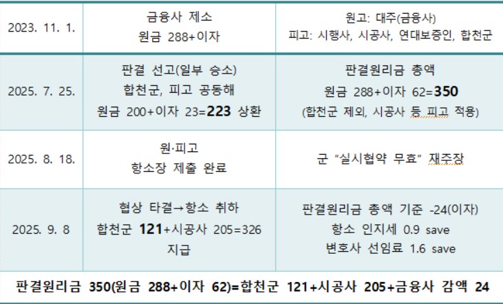 피고 합천군은 8일, 원금과 이자를 합쳐 1심 법원이 정한 총 손해배상금 약 350억 원 중 35% 수준인 121억 원을 원고인 대주(이하 금융사) 측에 전달(최초 130억 원 가지급 이후 9억 원 감액)하며 2년에 걸친 채무 관계 다툼의 마침표를 찍고 항소를 취하했다.