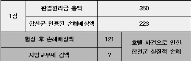 합천군은 재판 초기 판결원리금 전체를 부담하게 될 수도 있다는 군민 우려를 깨고 나름 선방했다는 자체 평가를 내놨다.